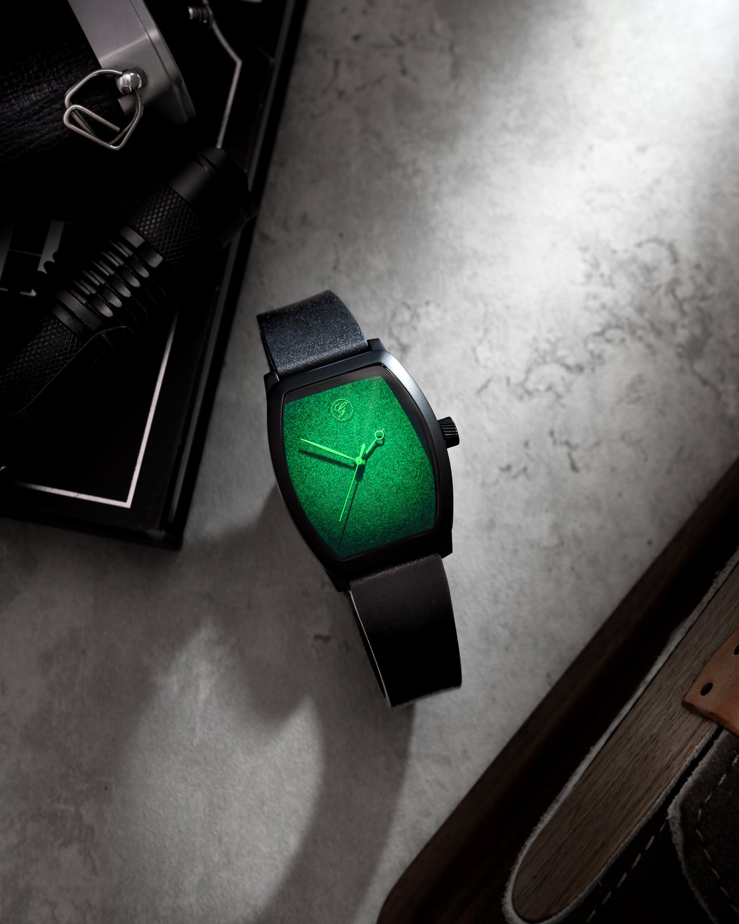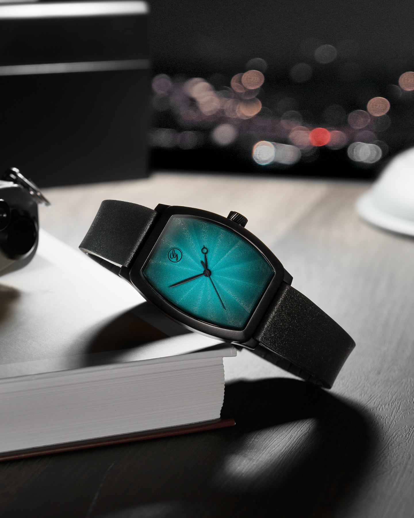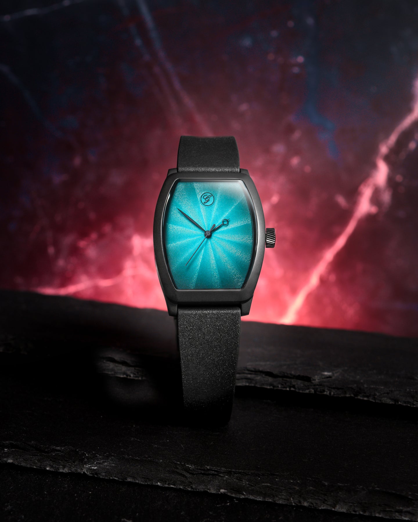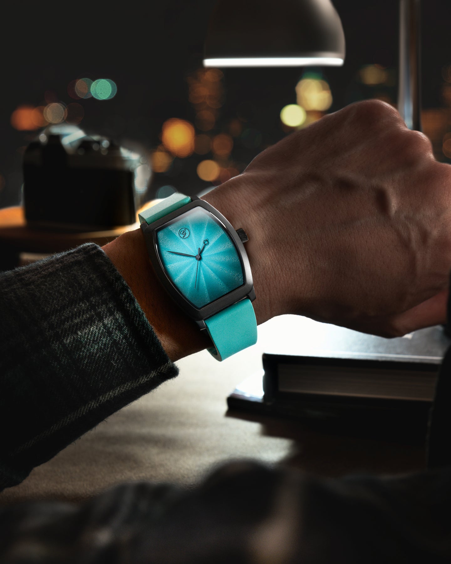 This luminous edition features a fumed turquoise dial with a mesmerizing luminous gradient. The guilloché-style texture is elevated by bold black C3 lume accents on the hands, logo, and crown. The fade effect itself is created using BGW9 Swiss Super-LumiNova - yes, the luminova is what forms the gradient!